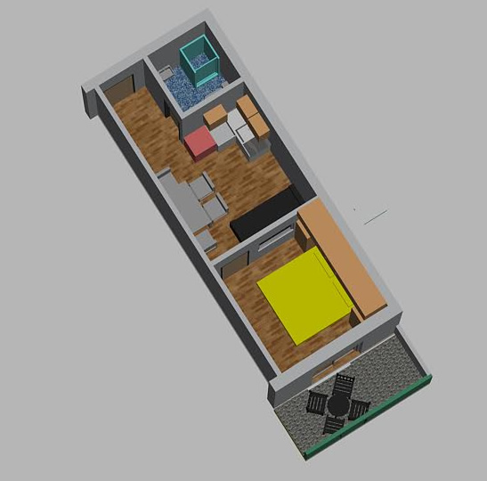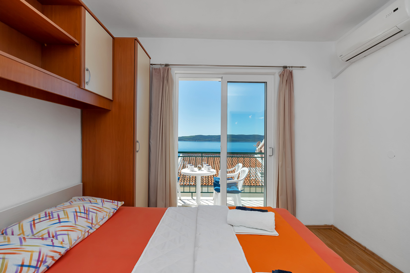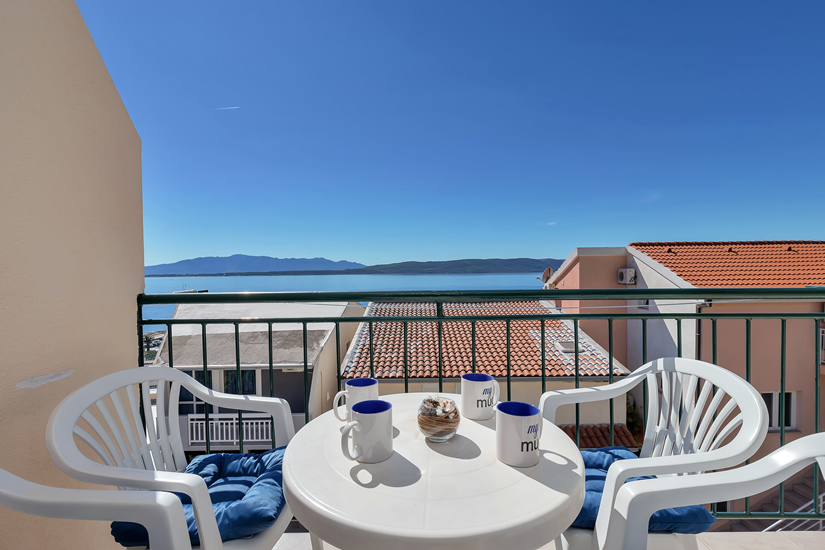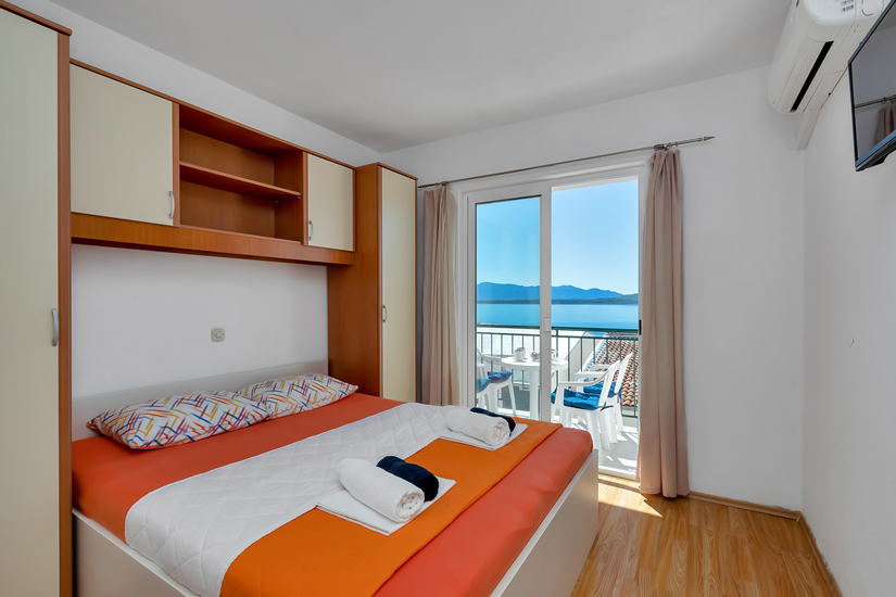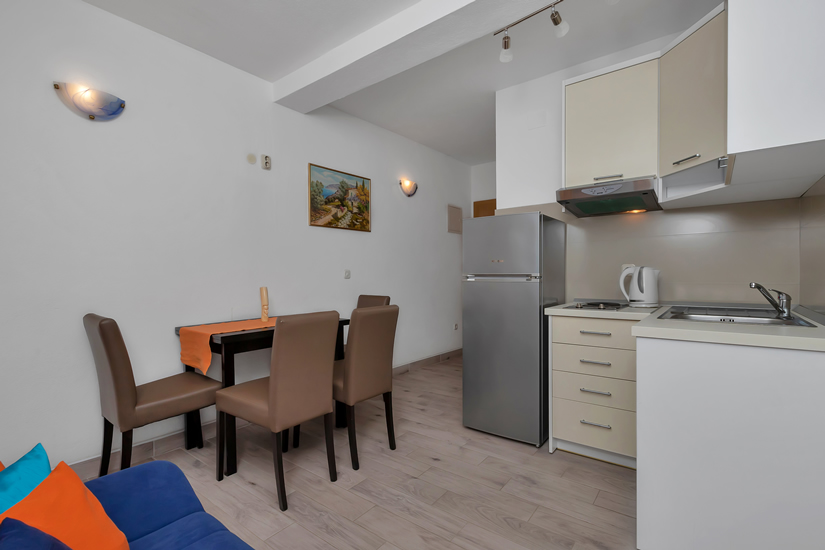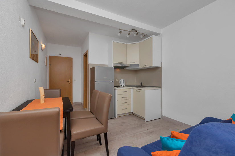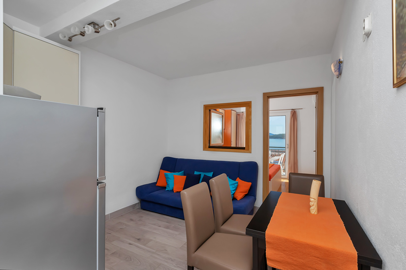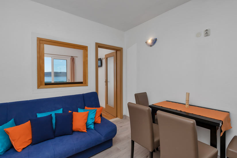 Apartman A6 (2+2) nalazi se na drugom katu. Može primiti maksimalno četiri osobe. Sastoji se od kuhinje sa sofom na razvlačenje, kupaonice, odvojene spavaće sobe s bračnim krevetom te balkona s pogledom na more. U apartmanu su nova kuhinja i nove pločice. Apartman je idealan za parove, troje odraslih ili dvoje odraslih i dvoje djece.