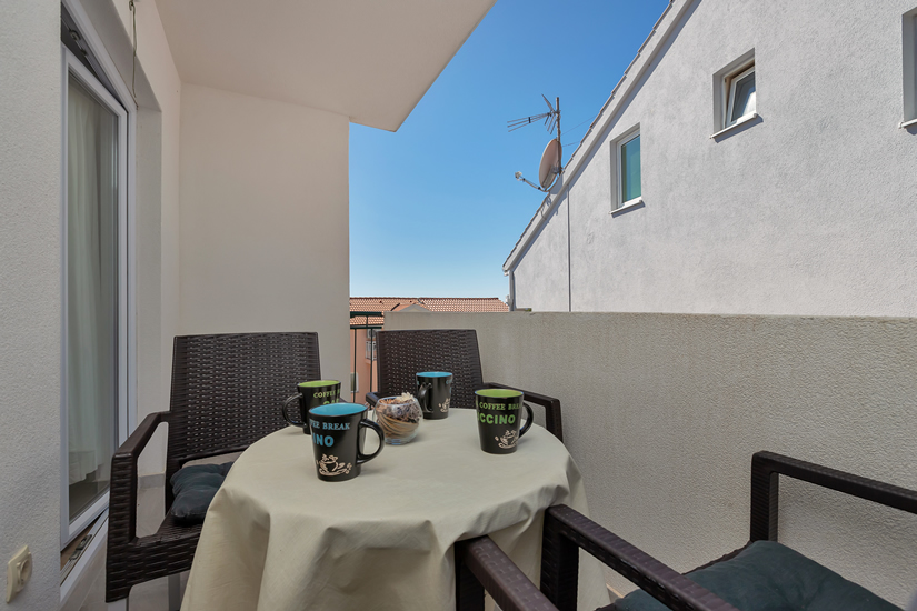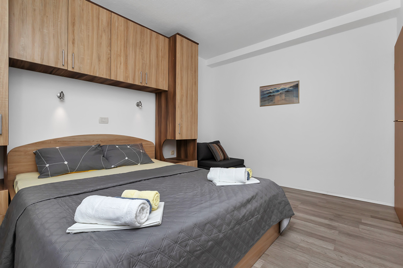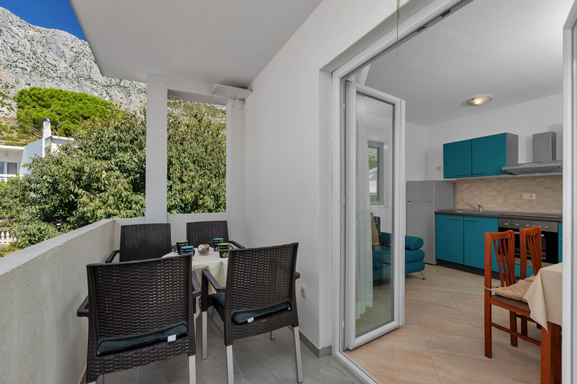 Apartman A8 (2+3) nalazi se na drugom katu. Može primiti maksimalno pet osoba. Sastoji se od kuhinje sa sofom na razvlačenje, kupaonice, odvojene spavaće sobe s bračnim krevetom i pomoćnim krevetom za jednu osobu i terase. U apartmanu je sve potpuno novo. Pogled iz kuhinje, spavaće sobe i terase je prema planini Biokovo. Apartman je idealan za tri, četiri ili pet odraslih osoba.